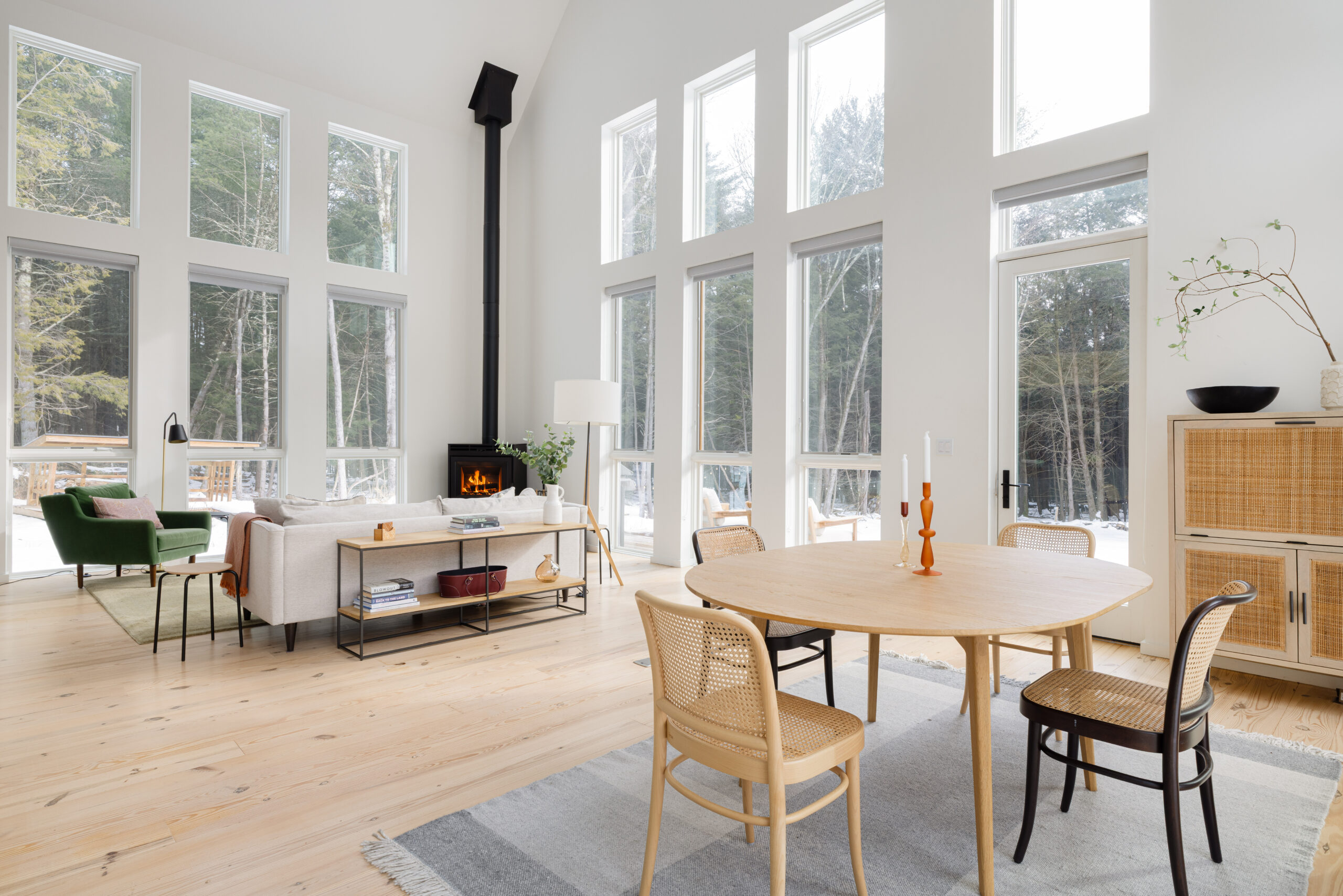 Through a spacious foyer, enter into Bethel Pines. To the right, the home’s airy open-concept living space boasts 30-foot cathedral ceilings, floor-to-ceiling windows with forest views, a classic wood-burning stove, and a glass door leading to a spacious terrace. The living space is anchored by an impressive chef’s kitchen, complete with Reform oak cabinetry, stainless steel appliances, and a quartz eat-in island with integrated refrigerated drawers. Its dark facade contrasts with the rest of the first level’s bright interiors, making it a sleek backdrop for entertaining.