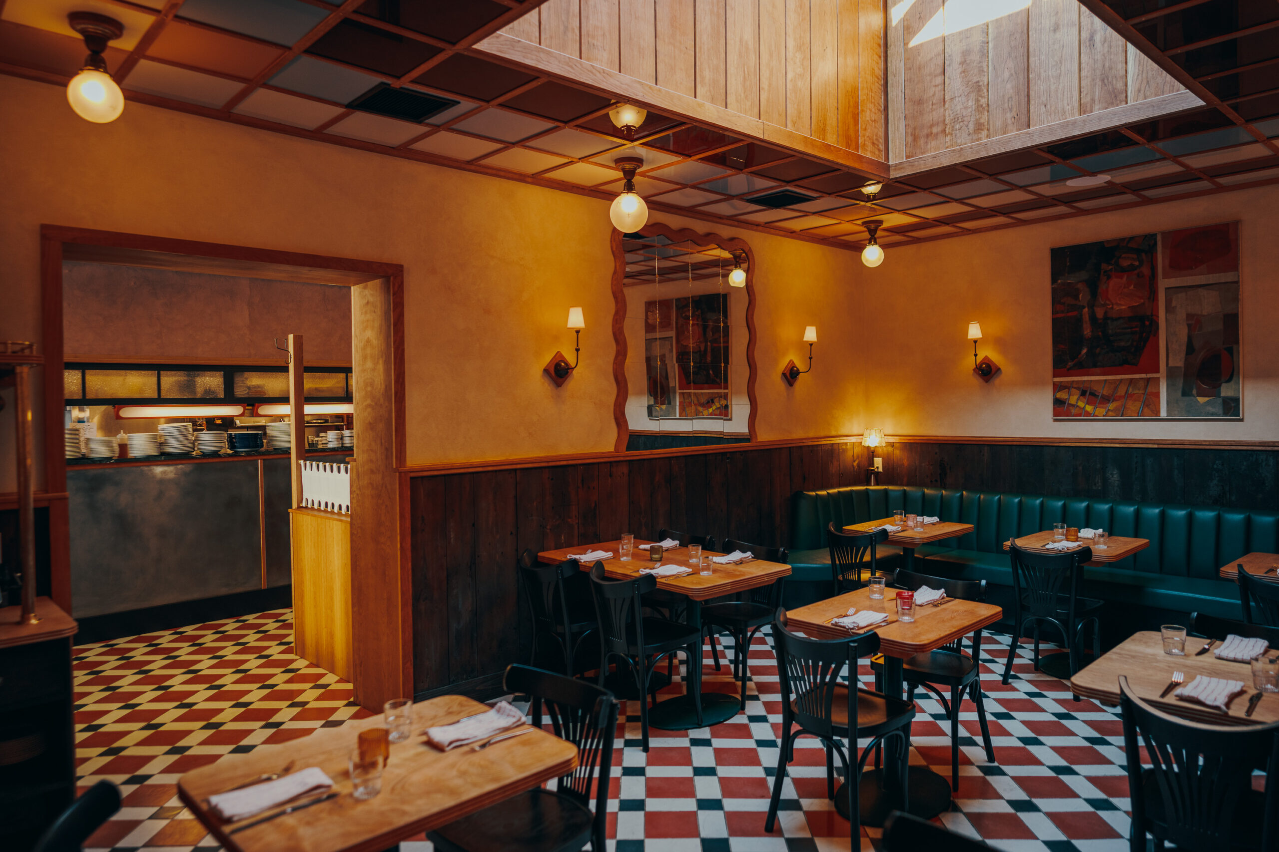The back dining room at Eliza pairs warm lighting, checkered floors, and curved booths — a cozy Midtown Kingston setting built for cocktails and plates to share. Photo: Josh Goleman.