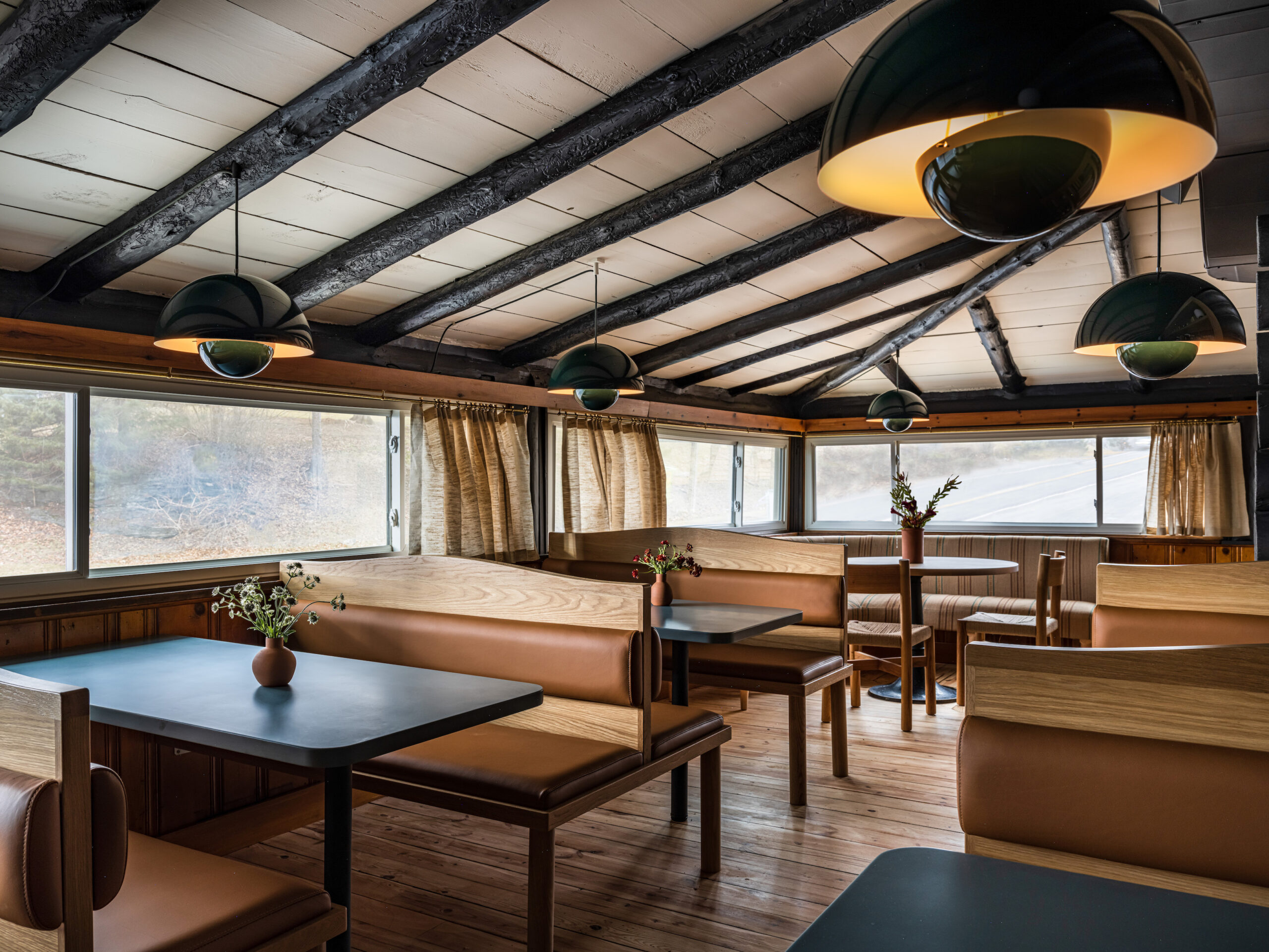 Warm wood, low beams, and leather banquettes set the tone inside Casa Susanna’s intimate dining room — a softly lit space designed for passing plates and lingering over dinner. Photo: Upland Creative Co.