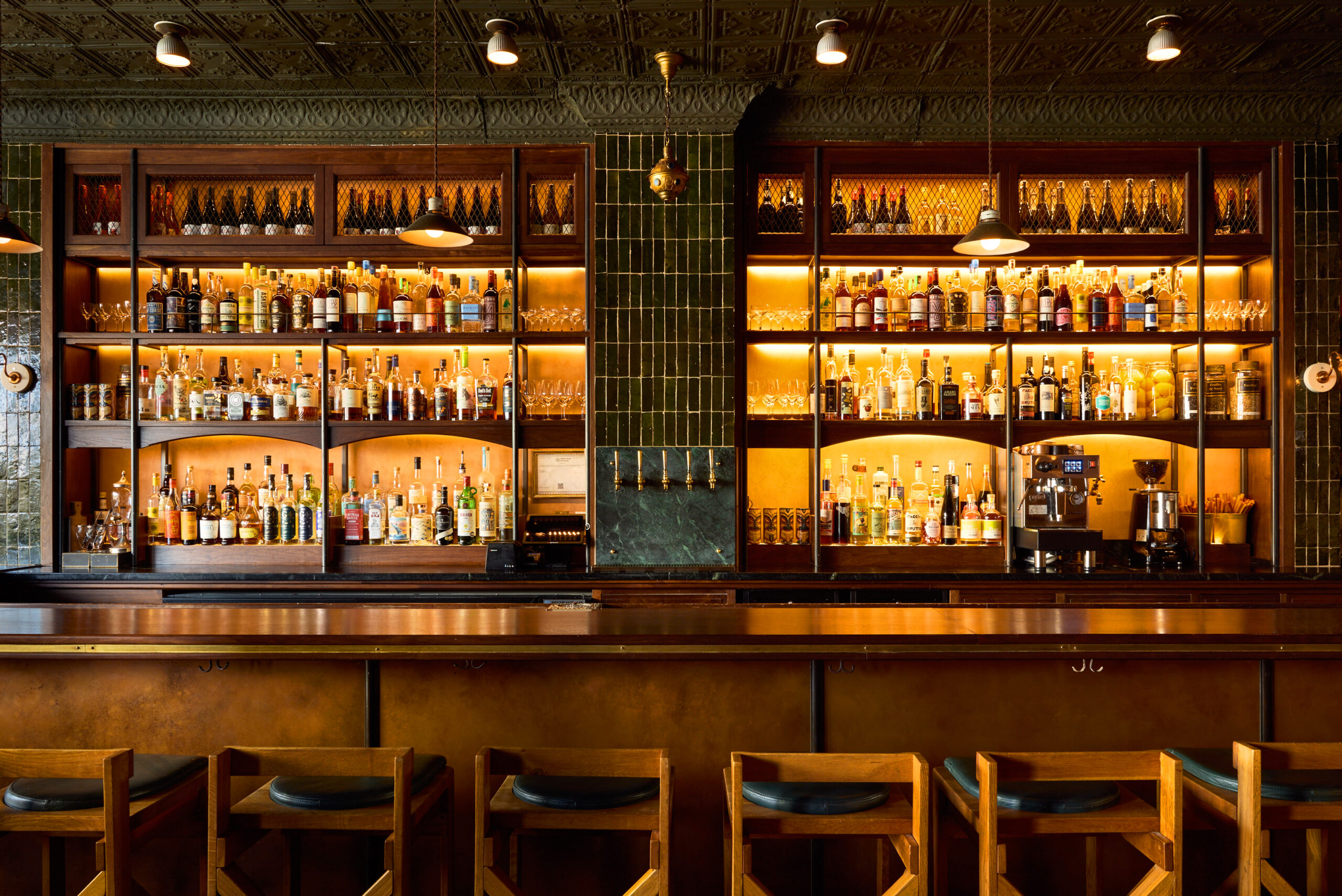 The Hereafter’s glowing bar sets the tone — warm wood, rows of spirits, and a low-lit, intimate spot to start or end the night in Hudson. Photo: Lauren Damaskinos.