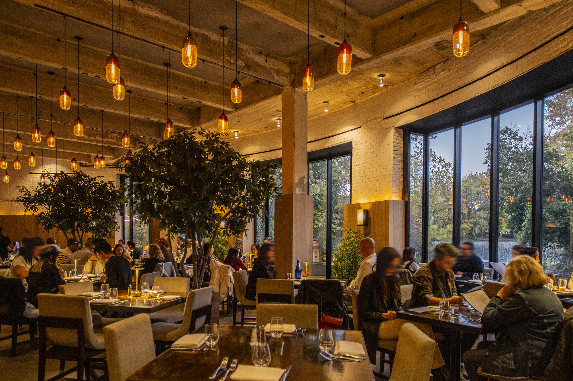 The dining room at Roundhouse looks out over Beacon Falls — floor-to-ceiling windows framing the waterfall as warm light and industrial details set the mood inside. Photo: Megan Spiro