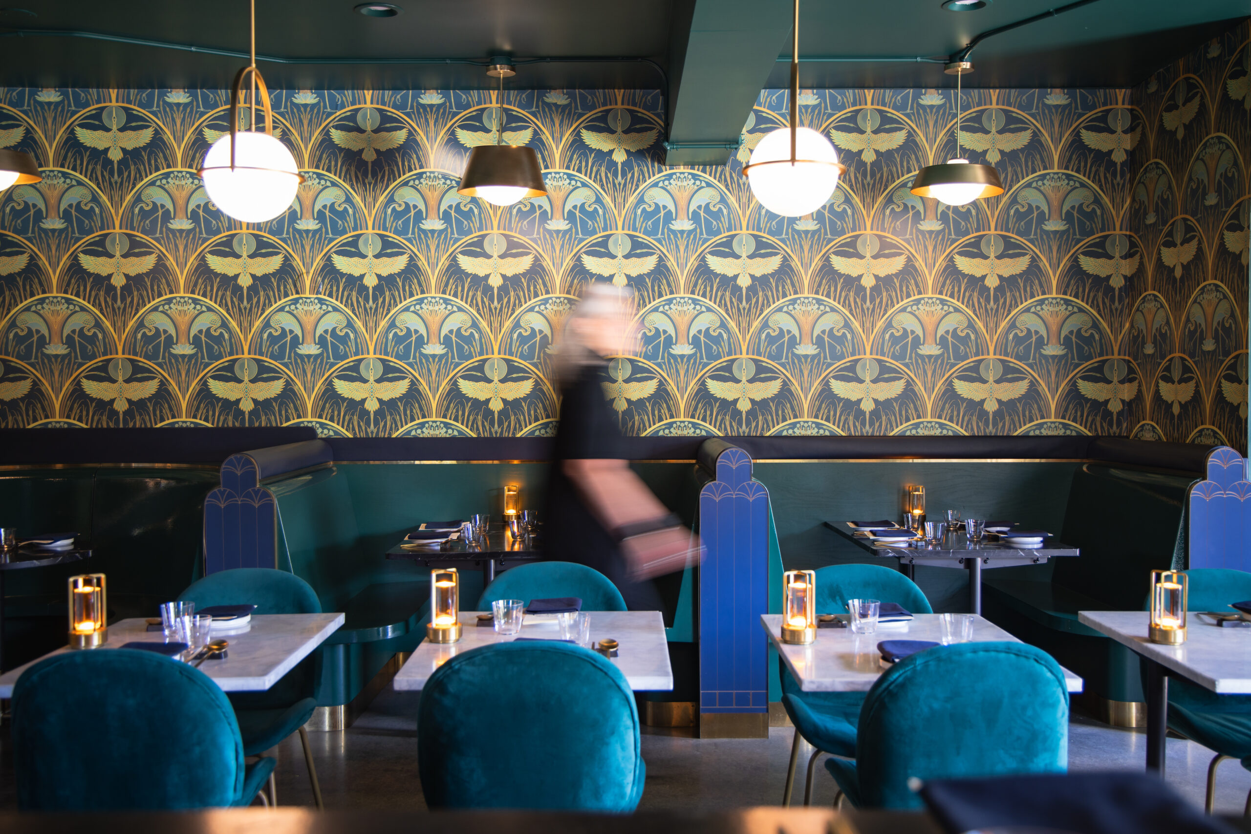 Threshold’s jewel-toned dining room pairs patterned walls, candlelit tables, and plush banquettes with an intimate, low-lit atmosphere that fills quickly — reservations are strongly recommended.