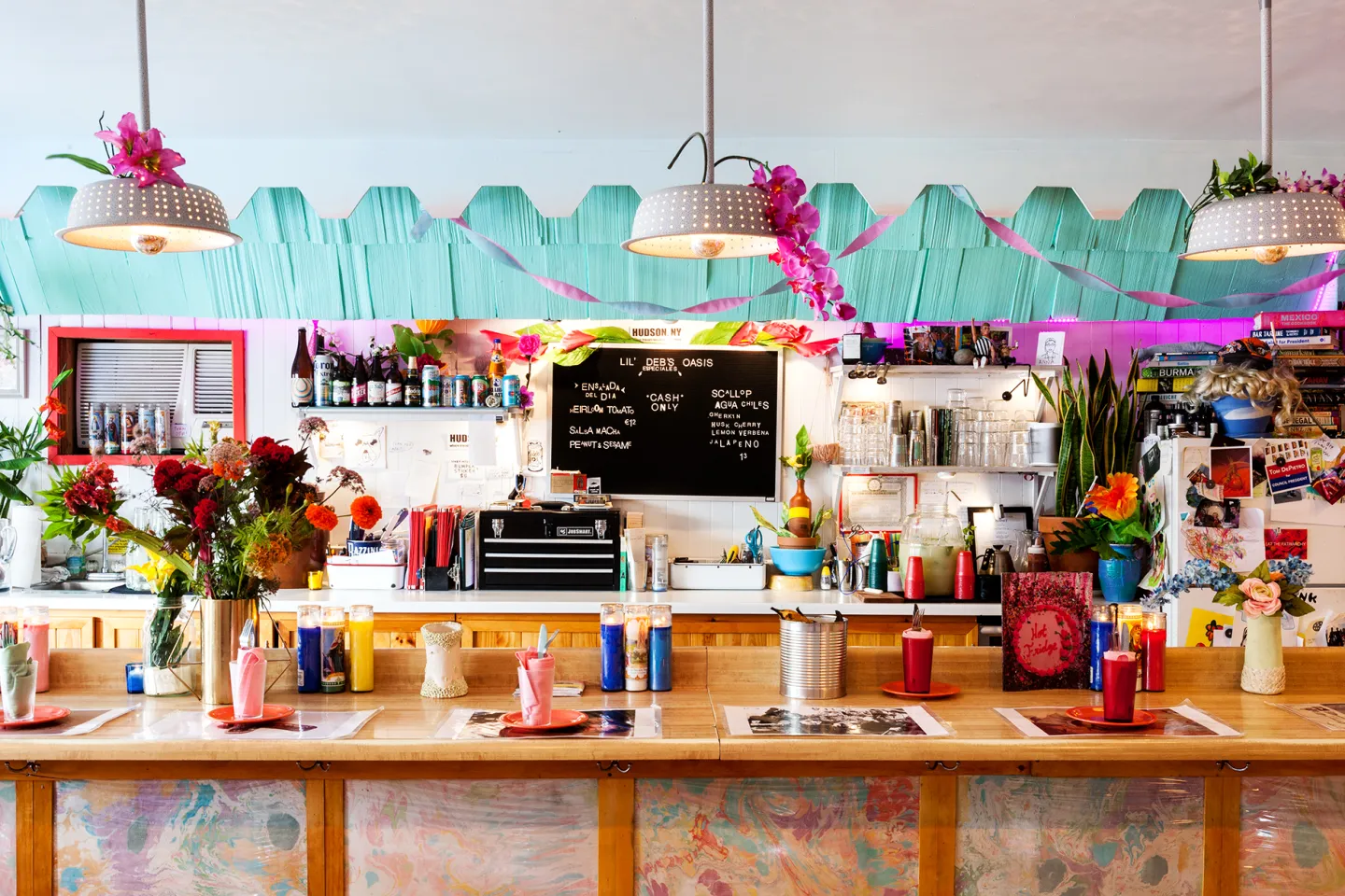 A riot of color and personality at Lil’ Deb’s Oasis, where the bar doubles as the heart of the room — equal parts dinner spot, gathering place, and night out in Hudson. Photo c/o Lil Deb’s Oasis.