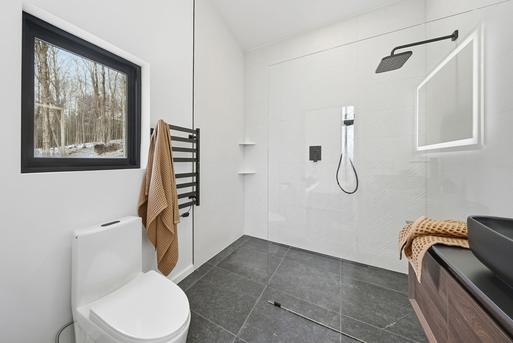 Two wings extend from either end of the living space, with the primary suite positioned as a private retreat set apart from the rest of the home. The space features tall ceilings, a private entrance opening onto the front porch, and a spa-like bathroom inspired by boutique European interiors. Seamless tile, a curbless shower, a heated towel warmer, and carefully selected finishes emphasize comfort and restraint. In the opposite wing, two guest bedrooms continue the home’s emphasis on openness and light, one with a second private entrance to the covered porch. A shared bathroom serves the guest rooms, finished with modern fixtures, a rainfall showerhead, and a deep soaking tub.