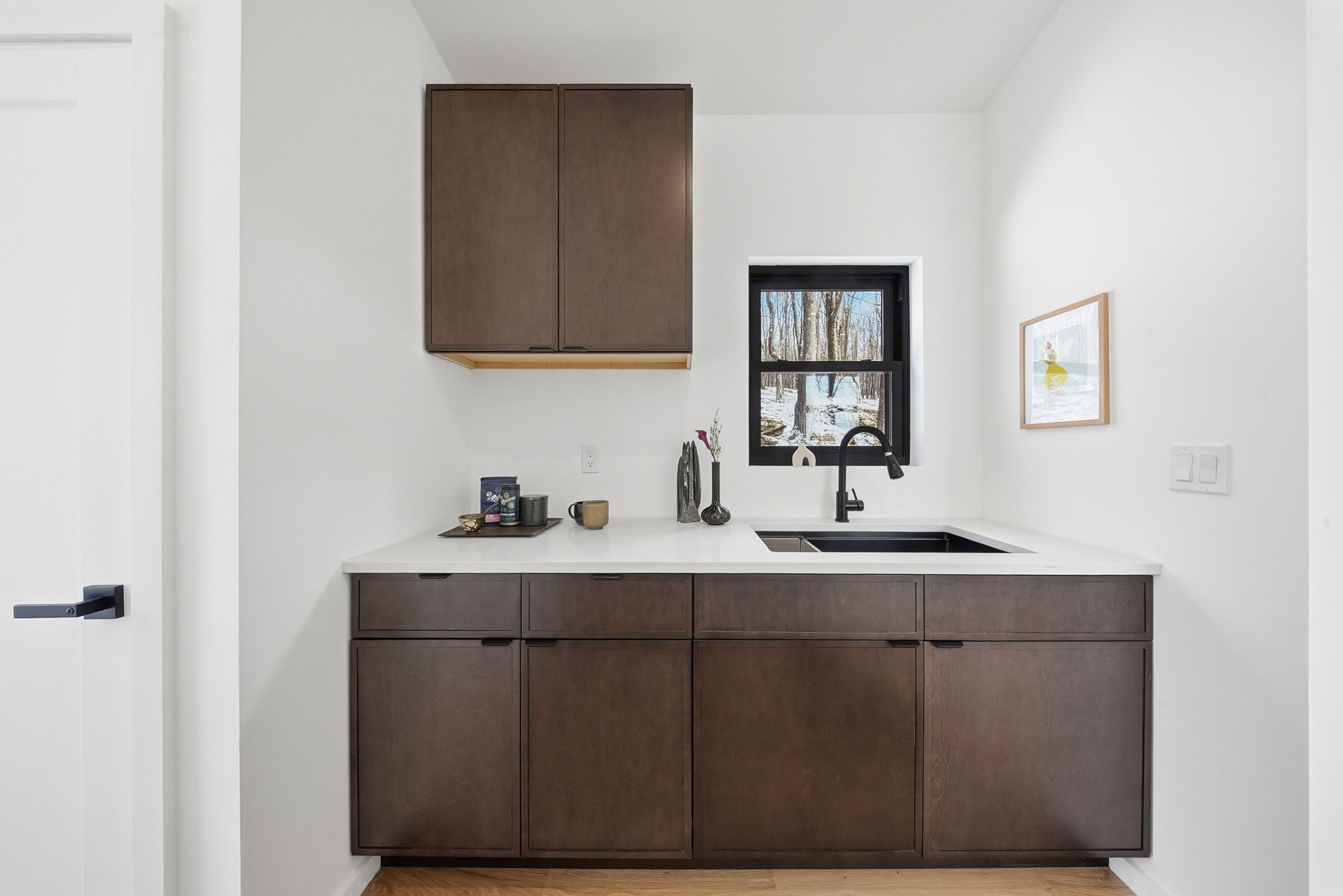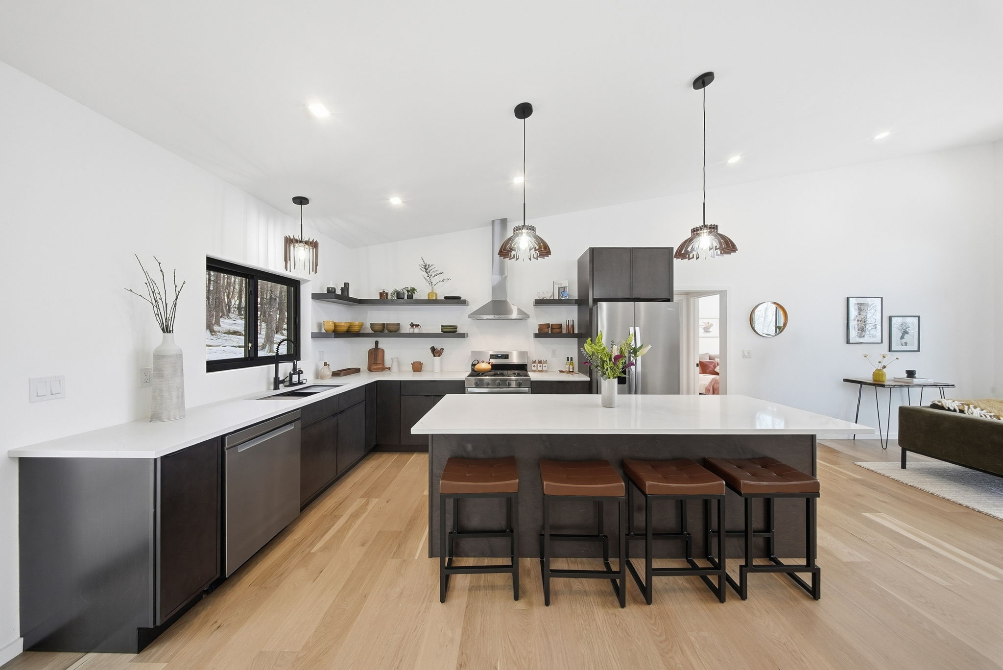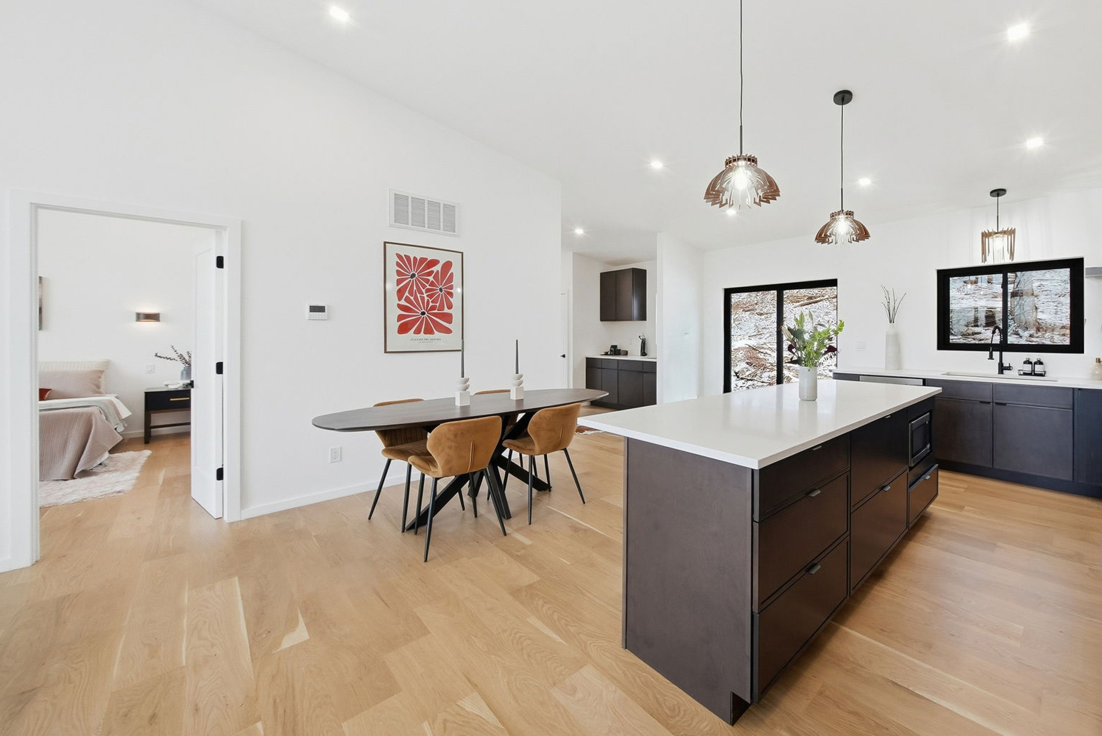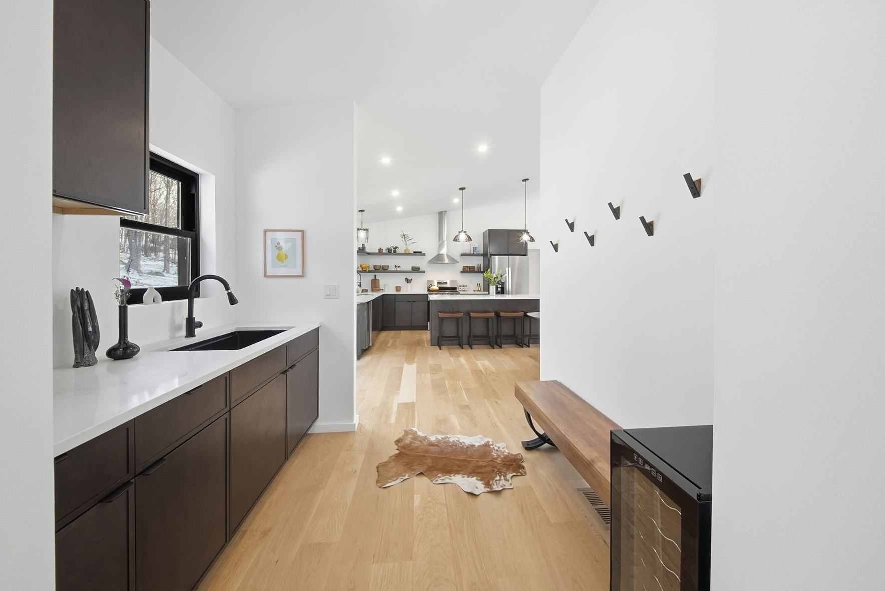 Through the side entrance, step into the home’s light-filled foyer, where a built-in coffee bar, sculptural bench, and wine cooler establish a thoughtful approach to everyday living. The foyer leads directly into the open-layout living area, anchored by a spacious chef’s kitchen positioned across from the entry. Organized around an oversized eat-in island, the kitchen features rich, dark cabinetry, stainless steel appliances, and sleek quartz countertops that add contrast and clarity to the space. To one side, sliding glass doors open onto the back deck, while the dining area sits adjacent, oriented toward the surrounding trees.