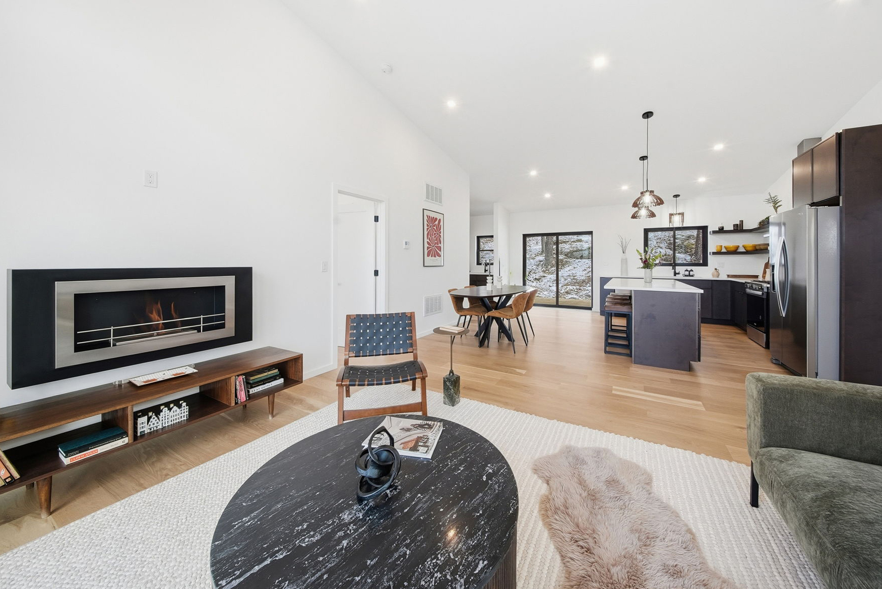 Light wood floors offset the home’s darker exterior and cabinetry, introducing an organic counterpoint that keeps the modern design grounded. A streamlined biofuel fireplace sits quietly within the living space, adding warmth and atmosphere without disrupting the home’s clear geometry. Throughout, materials and finishes work in quiet conversation with one another, reinforcing a cohesive, modern aesthetic that feels deliberate, calm, and carefully resolved.